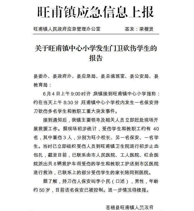 約在2020年6月4日上午8:30分,旺甫鎮中心小學校內發生一名保安持刀砍傷多名學生和教職工重大突發事件。 當日12時22分,蒼梧縣縣委宣傳部微信公號“今日蒼梧”發布通報稱,經初步核查,受傷人數39人,其中37人輕微傷,2人傷勢稍重,已全部送往醫院救治,無生命危險。 一名知情人士此前提供的一份《旺甫鎮應急信息上報材料》顯示,經初步統計,受傷學生和教職工約有40人,其中重傷3人,分別為旺小校長、另一名保安和一名學生。而持刀傷人者李某某,男性,約50歲。