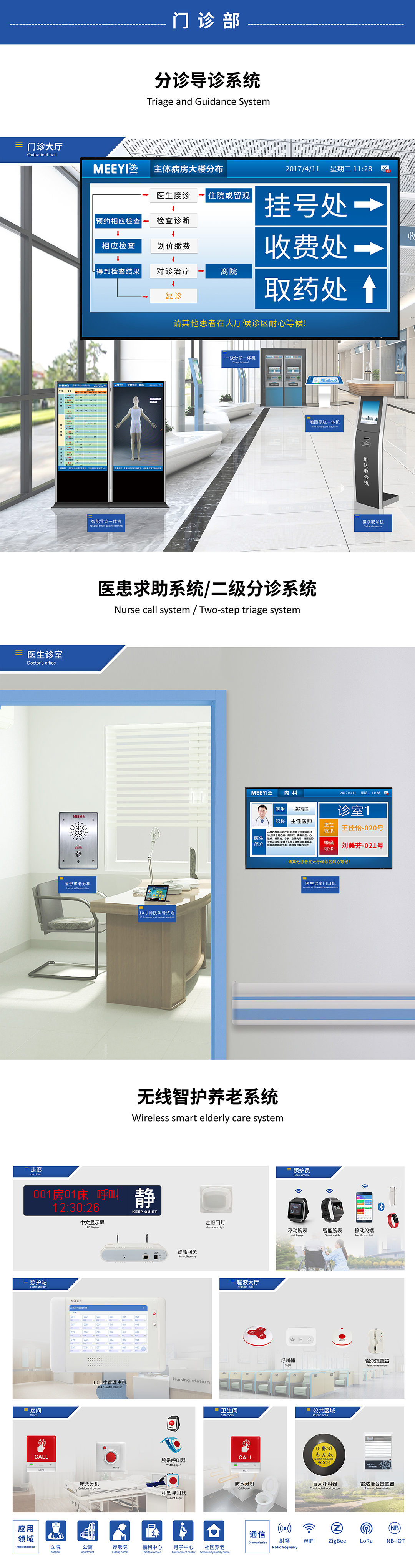 環宇通旗下MEEYI美一智慧醫養系統,包括了醫護對講、病房視訊、ICU探視、床旁交互、分診排隊、取藥叫號、信息發布、醫患求助等系統;最新研制的E6智慧醫養系統,結合了前沿的物聯網、大數據、人工智能、無線通訊等新技術,現實了醫護設備的智能化升級,可有效提高醫療服務質量,推動智慧醫院建設。